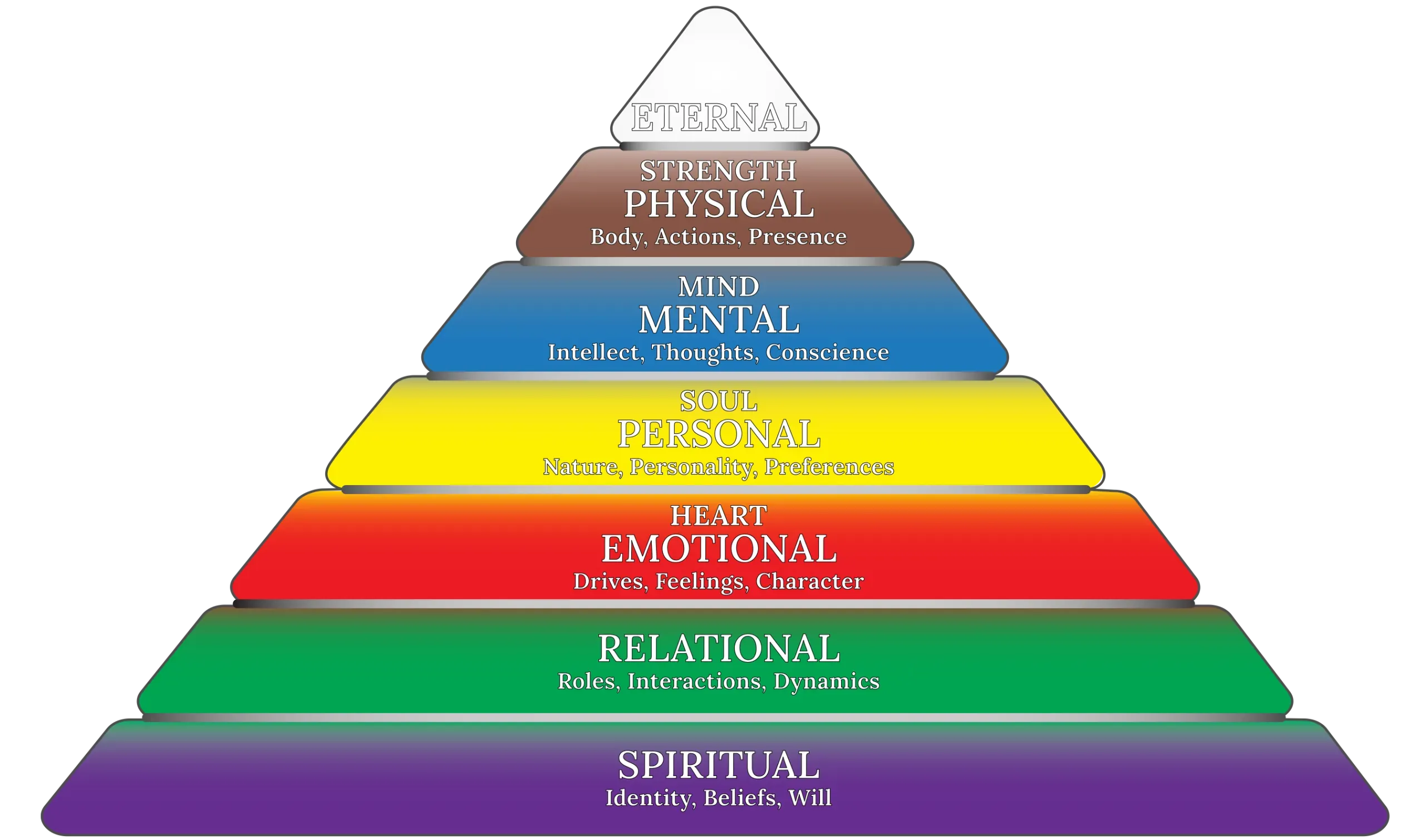 Christian counseling requires treating the whole person (body, mind, soul). We use God's Hierarchy of Needs to train counselors to serve with excellence in the 7 critical dimensions of existence: spiritual, relational, emotional, personal, mental, physical, and eternal.